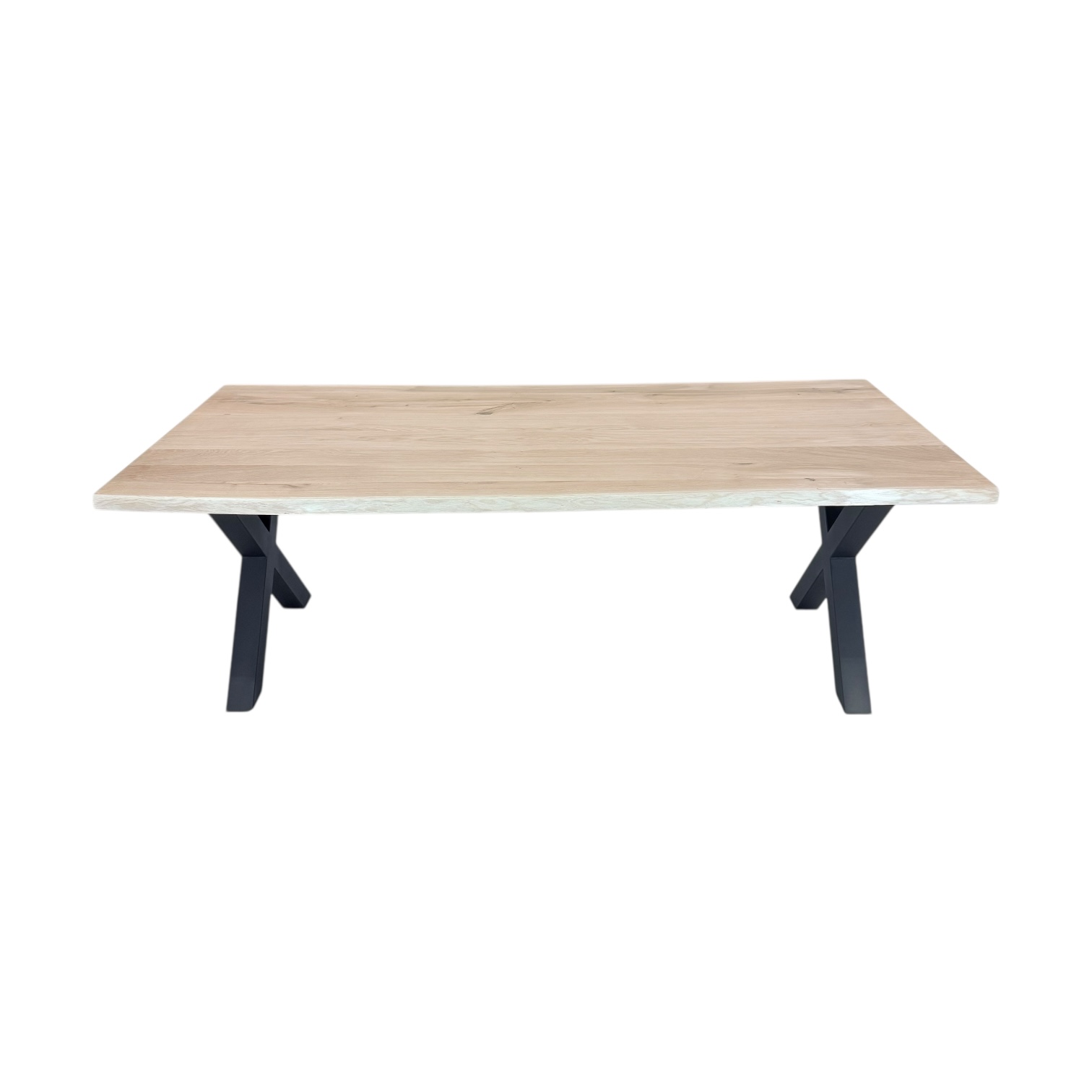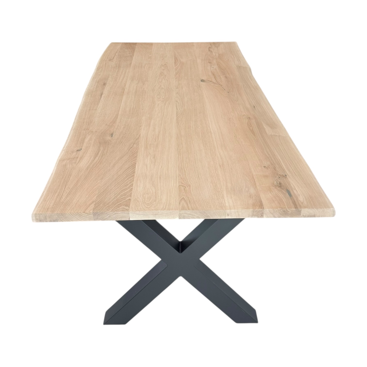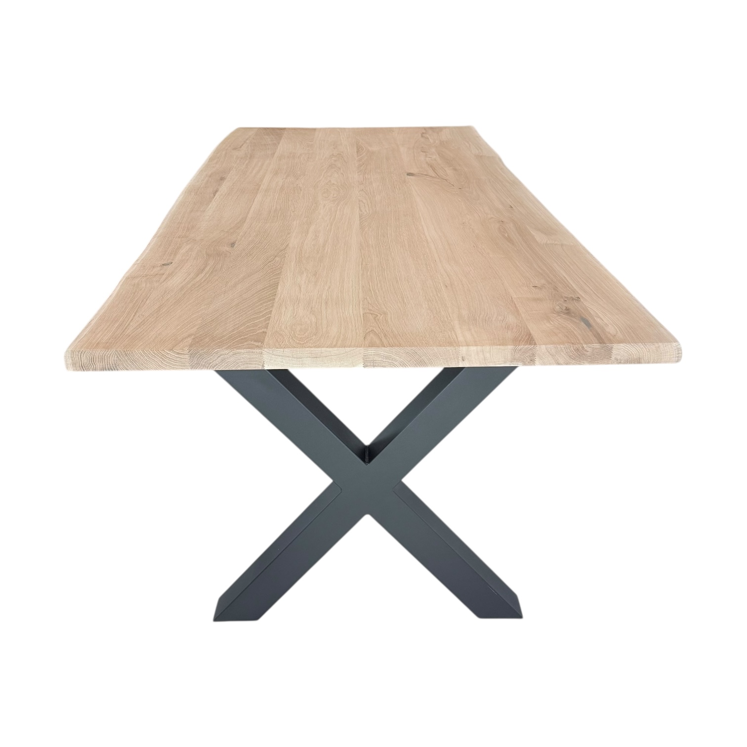 Massief eiken tafel met boomstamkant en stalen X-poten