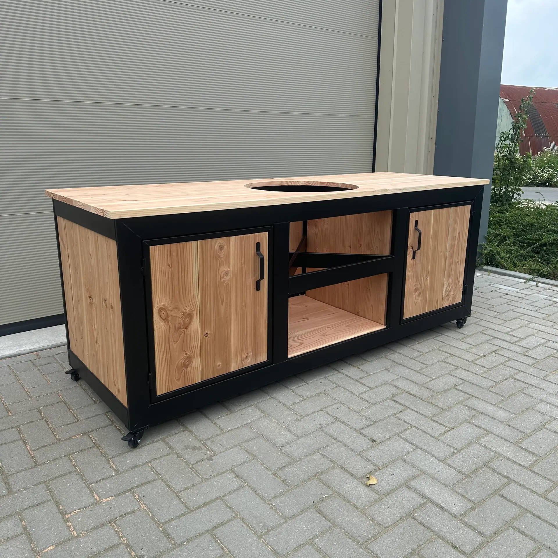 De buitenkeuken is voorzien van stevige zwarte wielen, ruime opbergmogelijkheden en een extra diepe achterkant, zodat je hem strak tegen een muur kunt plaatsen zonder dat het deksel van je kamado in de weg zit. Optioneel kun je het werkblad laten uitvoeren met keramische tegels – hitte-, kras- en weersbestendig én eenvoudig schoon te maken.