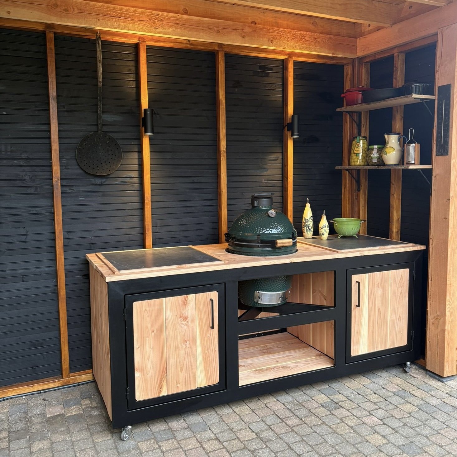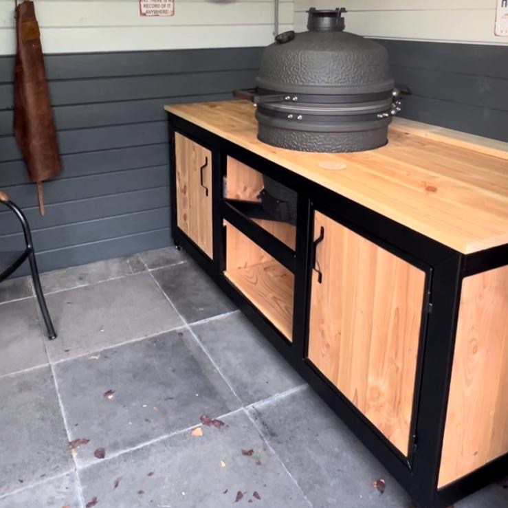 Voor de liefhebber van buiten koken is deze buitenkeuken van Maison DAM de perfecte combinatie van robuustheid, luxe en maatwerk. Het stalen frame en het warme Douglas hout vormen samen een stijlvolle basis voor jouw kamado barbecue – geschikt voor modellen als Yakiniku, Big Green Egg, Keij Kamado, The Bastard en meer.