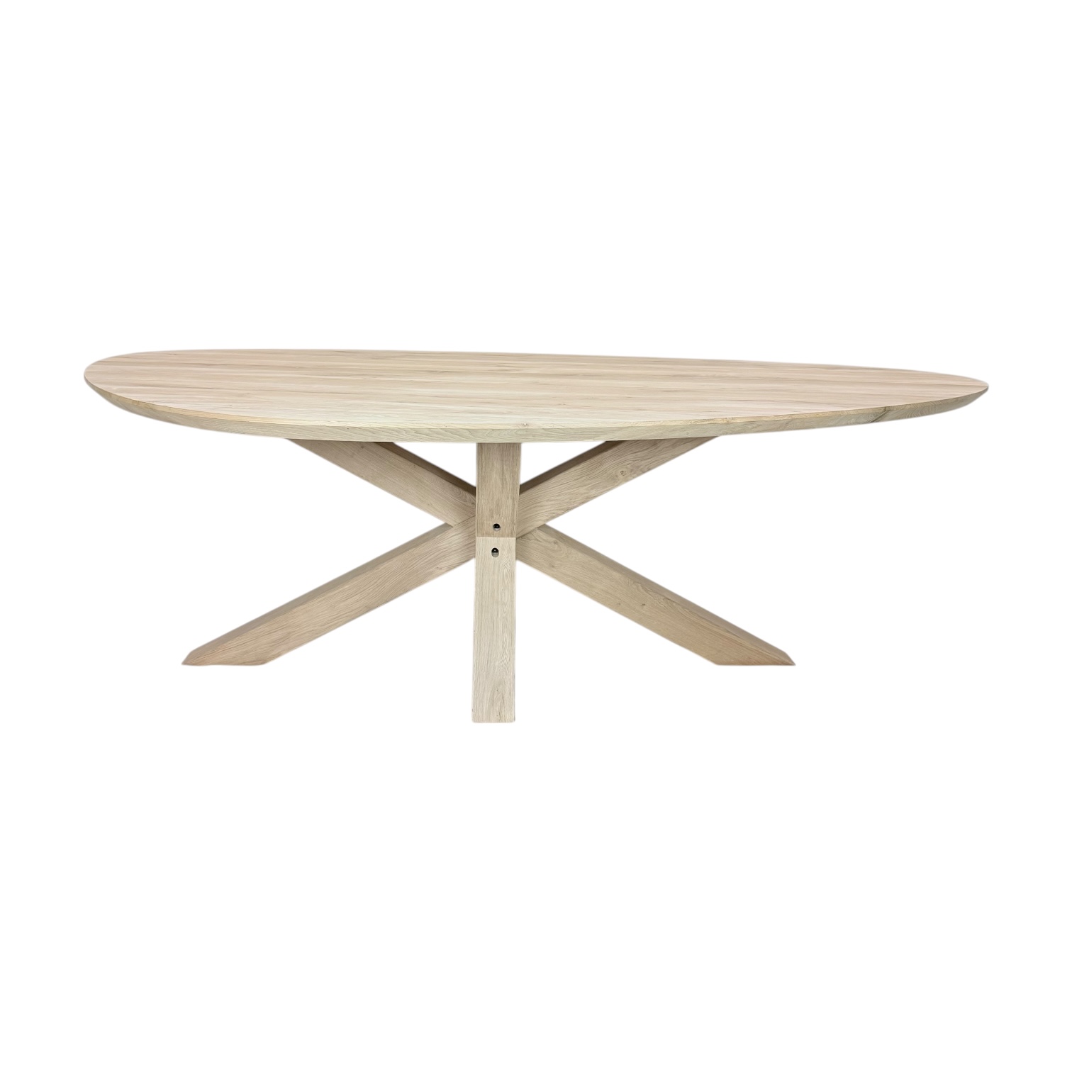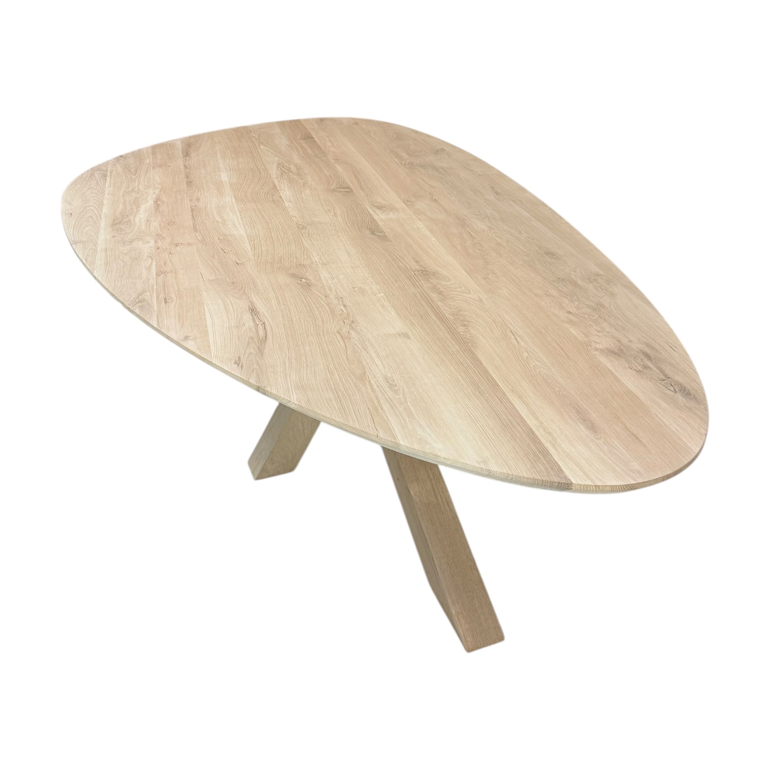 De massief eiken kiezel tafel van Maison DAM heeft een zachte, organische vorm die direct opvalt door zijn natuurlijke uitstraling. Zowel het blad als de eiken matrixpoot zijn volledig gemaakt van massief eikenhout, waardoor de tafel één mooi geheel vormt. Deze combinatie zorgt voor een warme en rustige sfeer in elke eetkamer.
