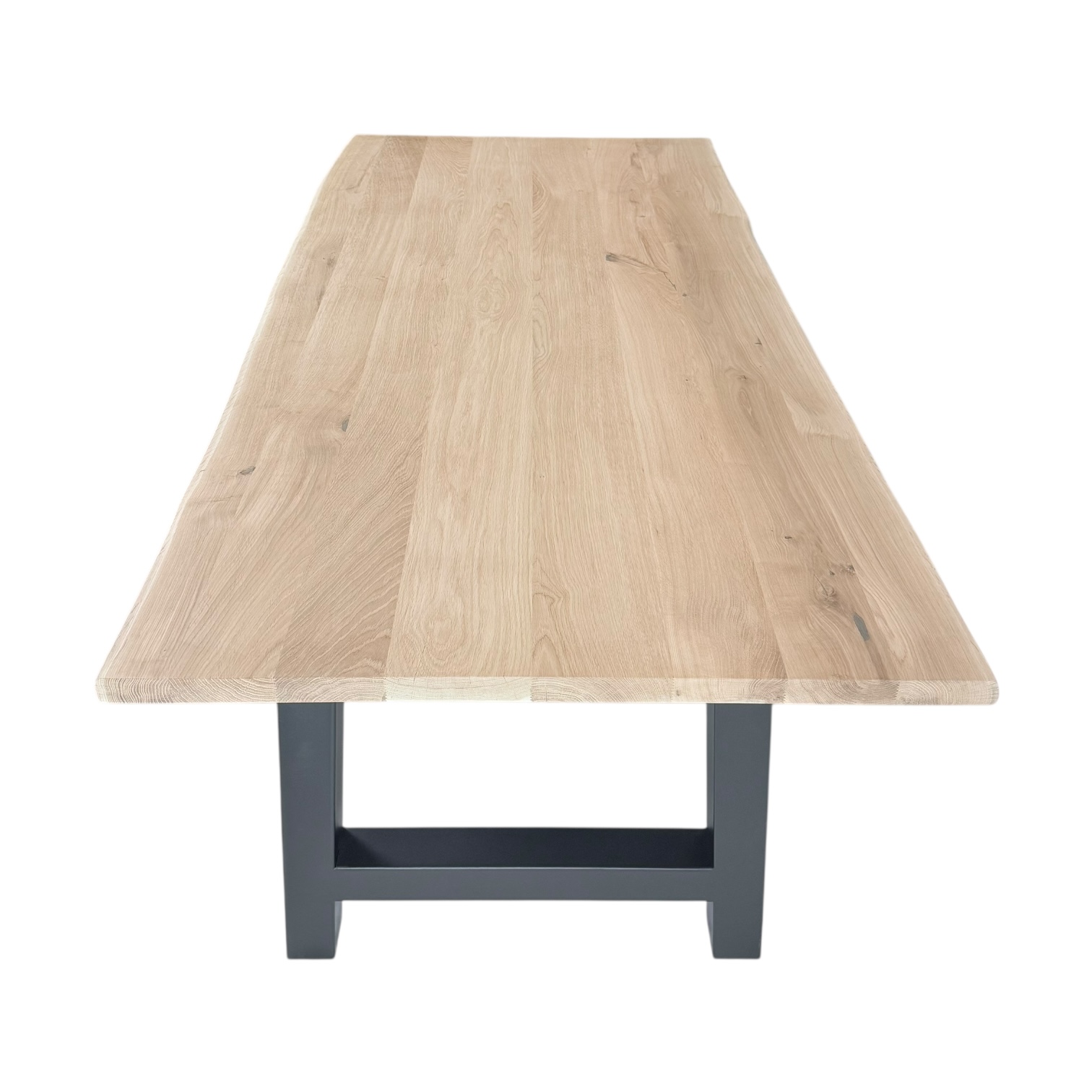 Wij gebruiken massief eiken meubelhout, kunstmatig gedroogd tot onder de 10% vochtgehalte. Dat zorgt voor een stabiel tafelblad dat geschikt is voor gebruik binnenshuis. De boomstamkant volgt de natuurlijke lijnen van het hout. Daardoor is geen enkele tafel precies hetzelfde. Standaard leveren wij het blad onbehandeld. In onze werkplaats kunnen we de tafel op wens afwerken met Rubio Monocoat olie in diverse kleuren & Skylt kleurloze matte lak voor een bijna onbehandelde look.
