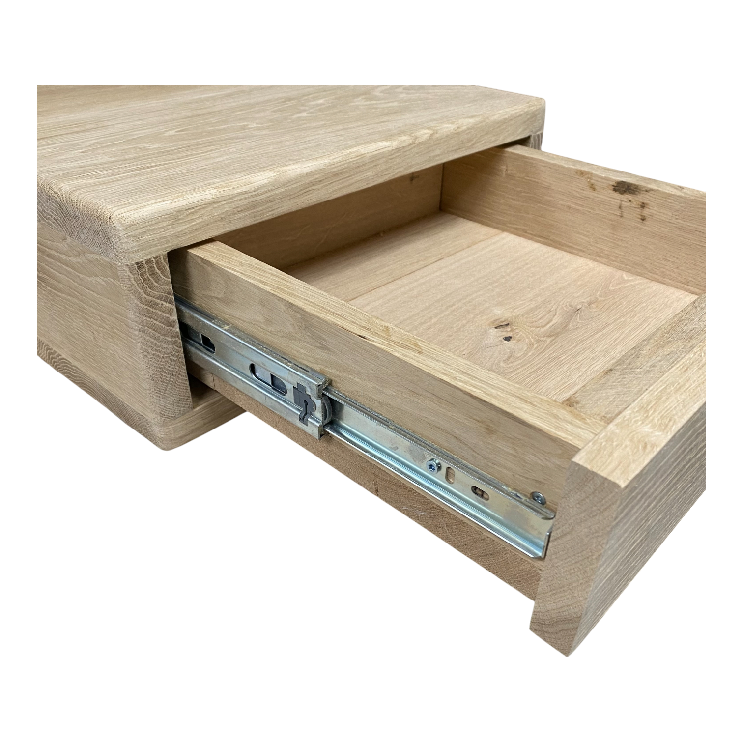 Het kastje wordt vervaardigd uit massief eikenhout (A/B), kunstmatig gedroogd tot 8–12 % vochtgehalte voor maximale stabiliteit binnenshuis.