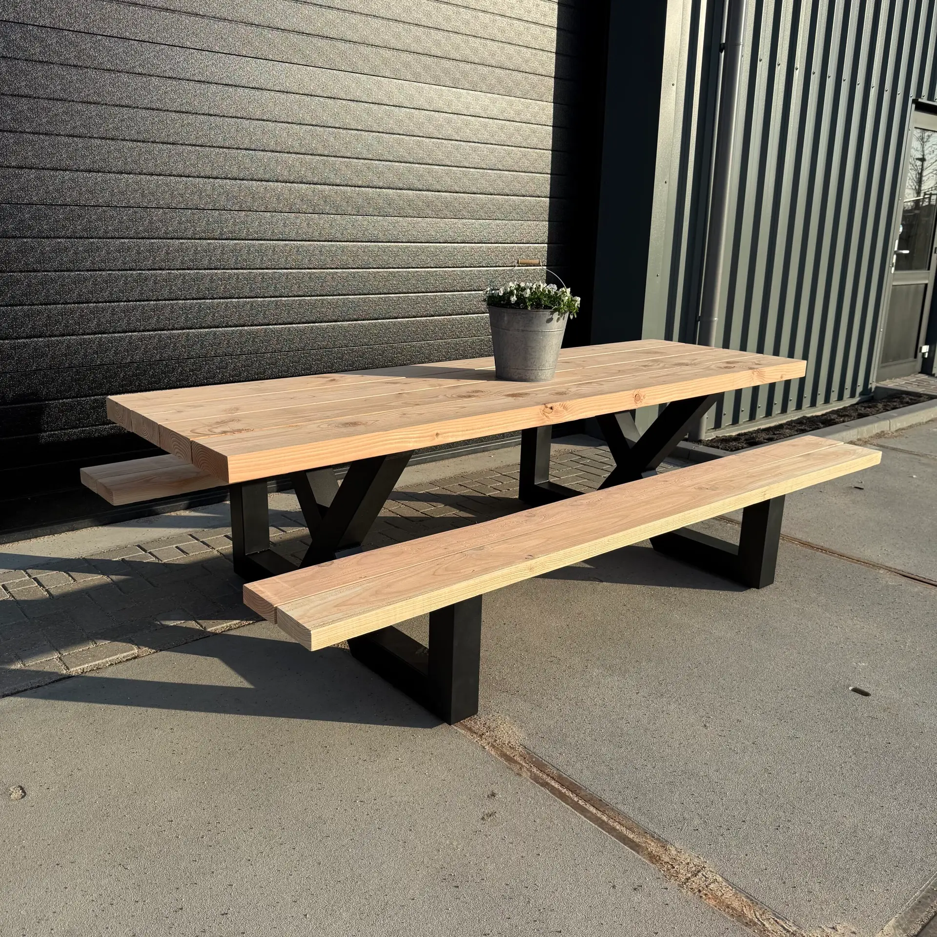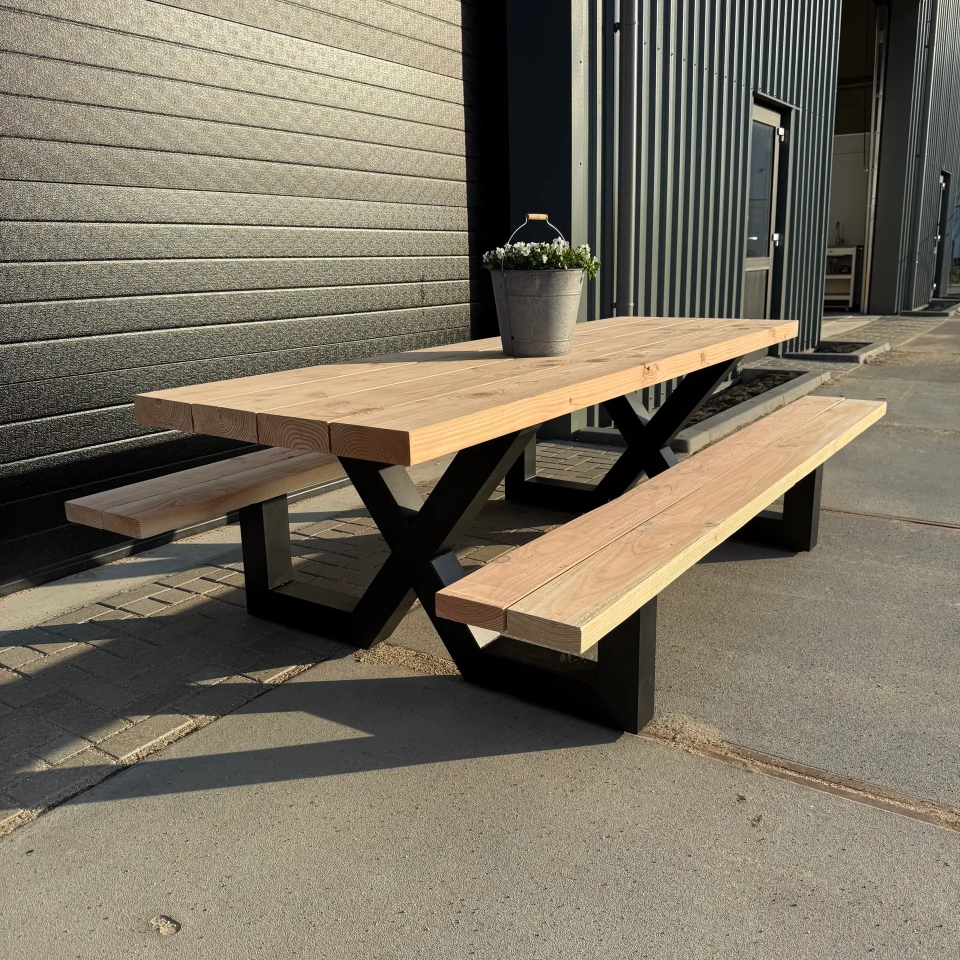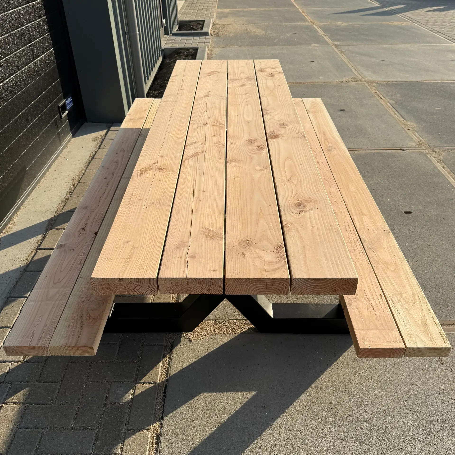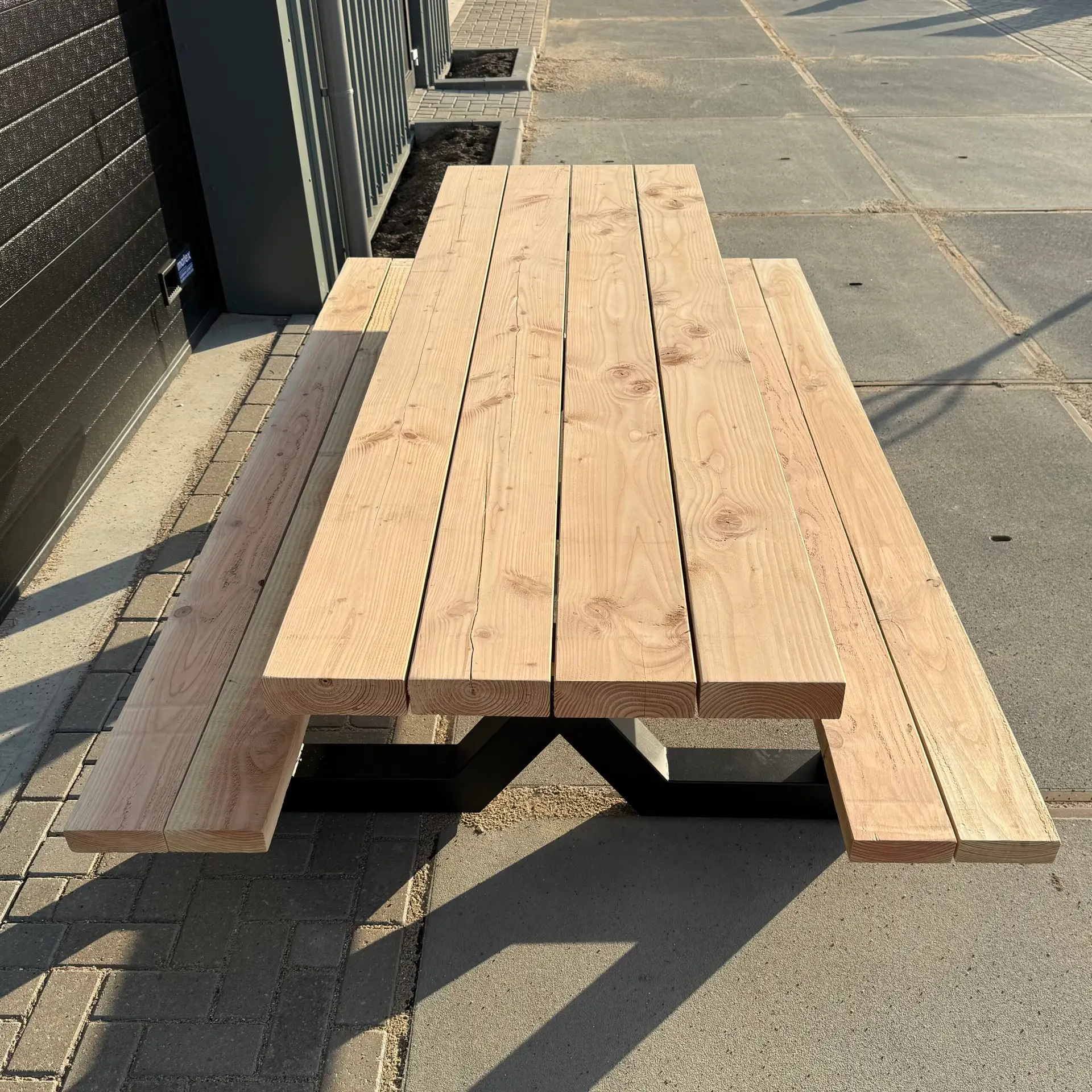 We gebruiken duurzaam Douglas-hout dat glad geschaafd en geschuurd is voor een natuurlijke afwerking zonder splinters. Het verzinkte stalen onderstel is solide en bestand tegen intensief gebruik. Voor wie maximale weersbestendigheid wil, is het frame ook leverbaar met een zwarte poedercoating en het hout met een Nano-coating behandeling.