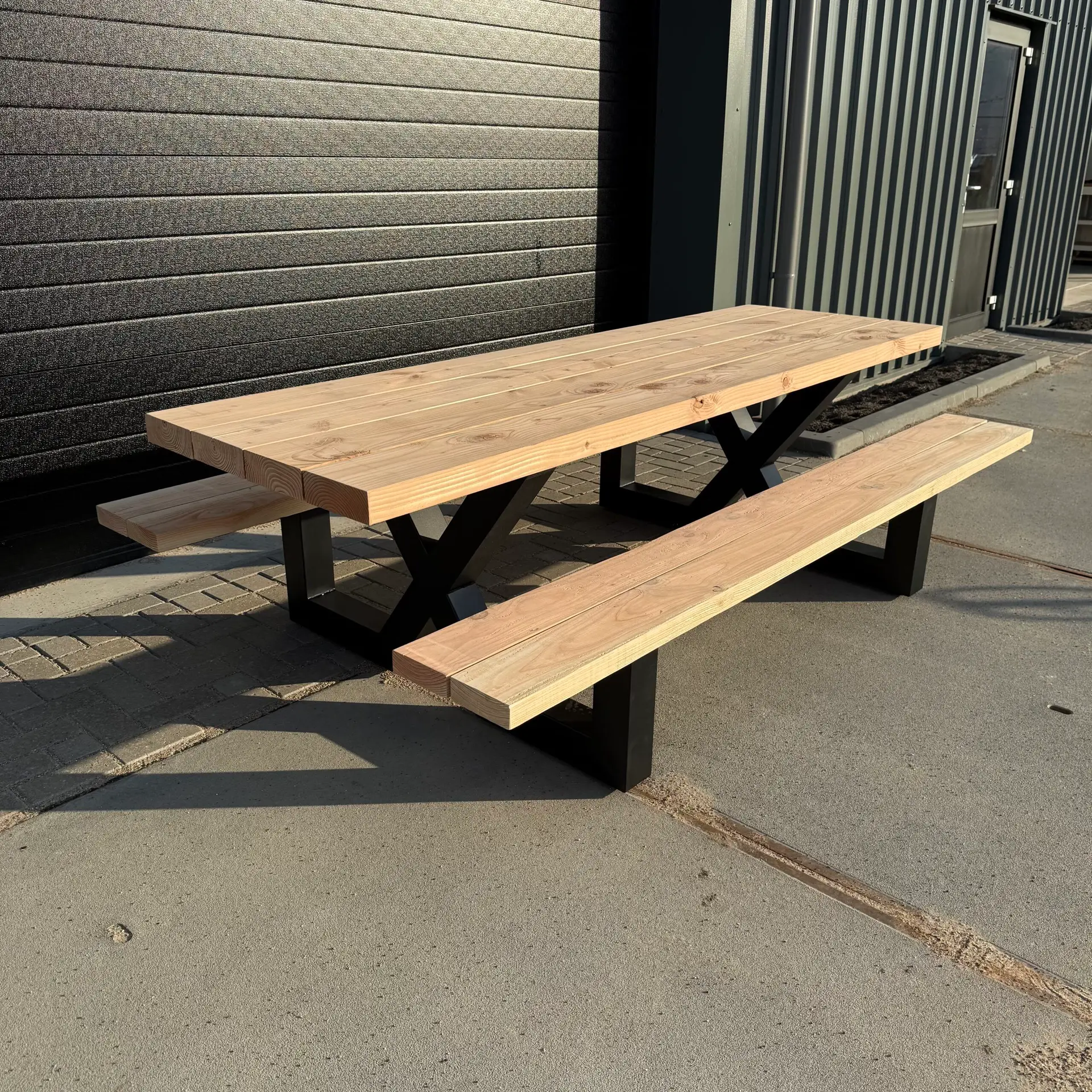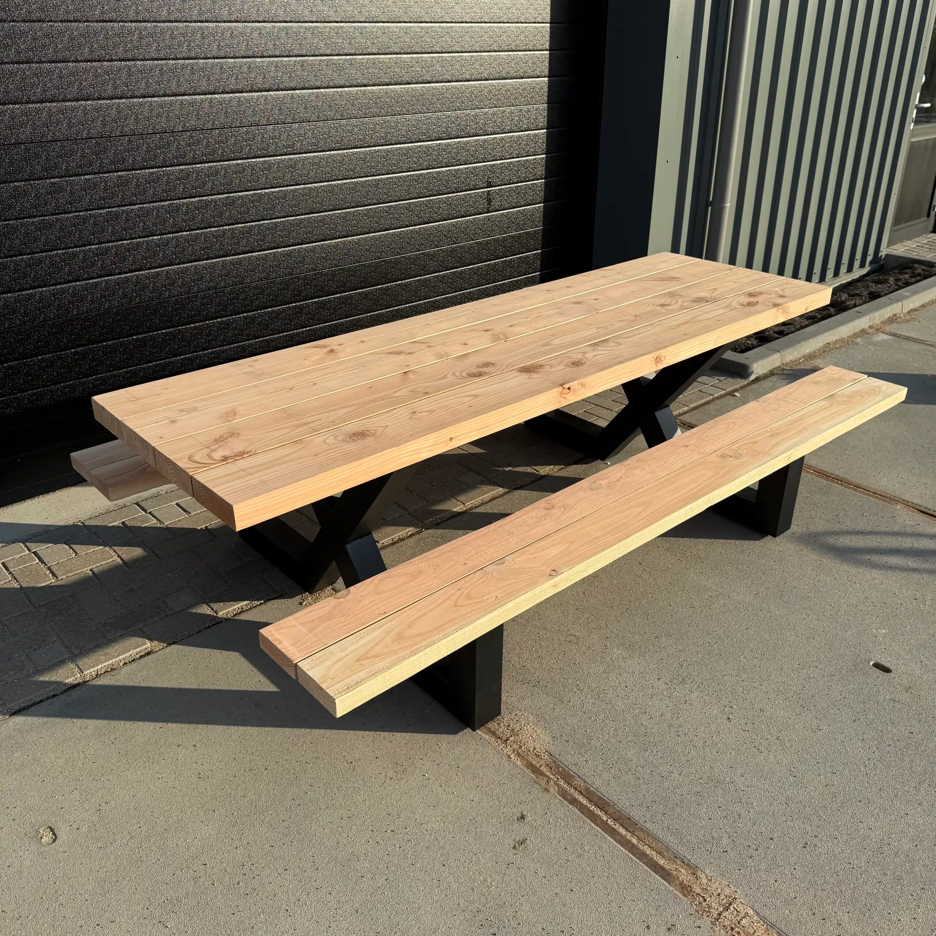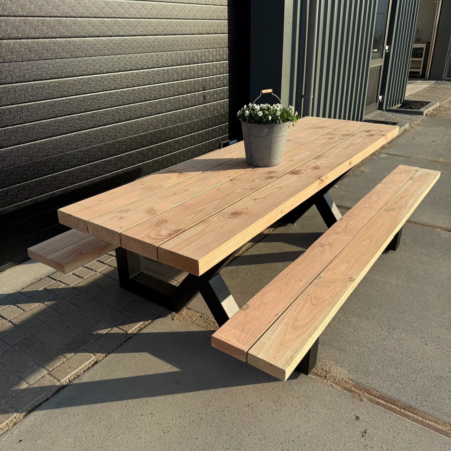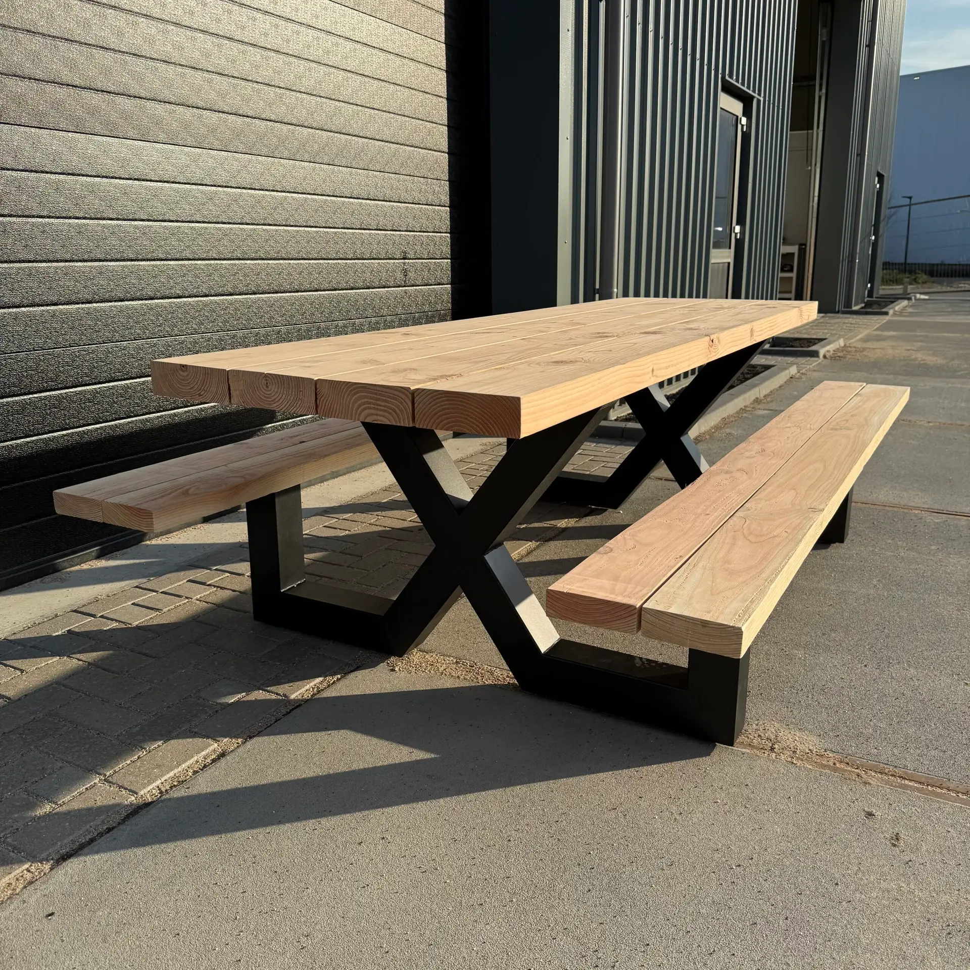 We gebruiken duurzaam Douglas-hout dat glad geschaafd en geschuurd is voor een natuurlijke afwerking zonder splinters. Het verzinkte stalen onderstel is solide en bestand tegen intensief gebruik. Voor wie maximale weersbestendigheid wil, is het frame ook leverbaar met een zwarte poedercoating en het hout met een Nano-coating behandeling.