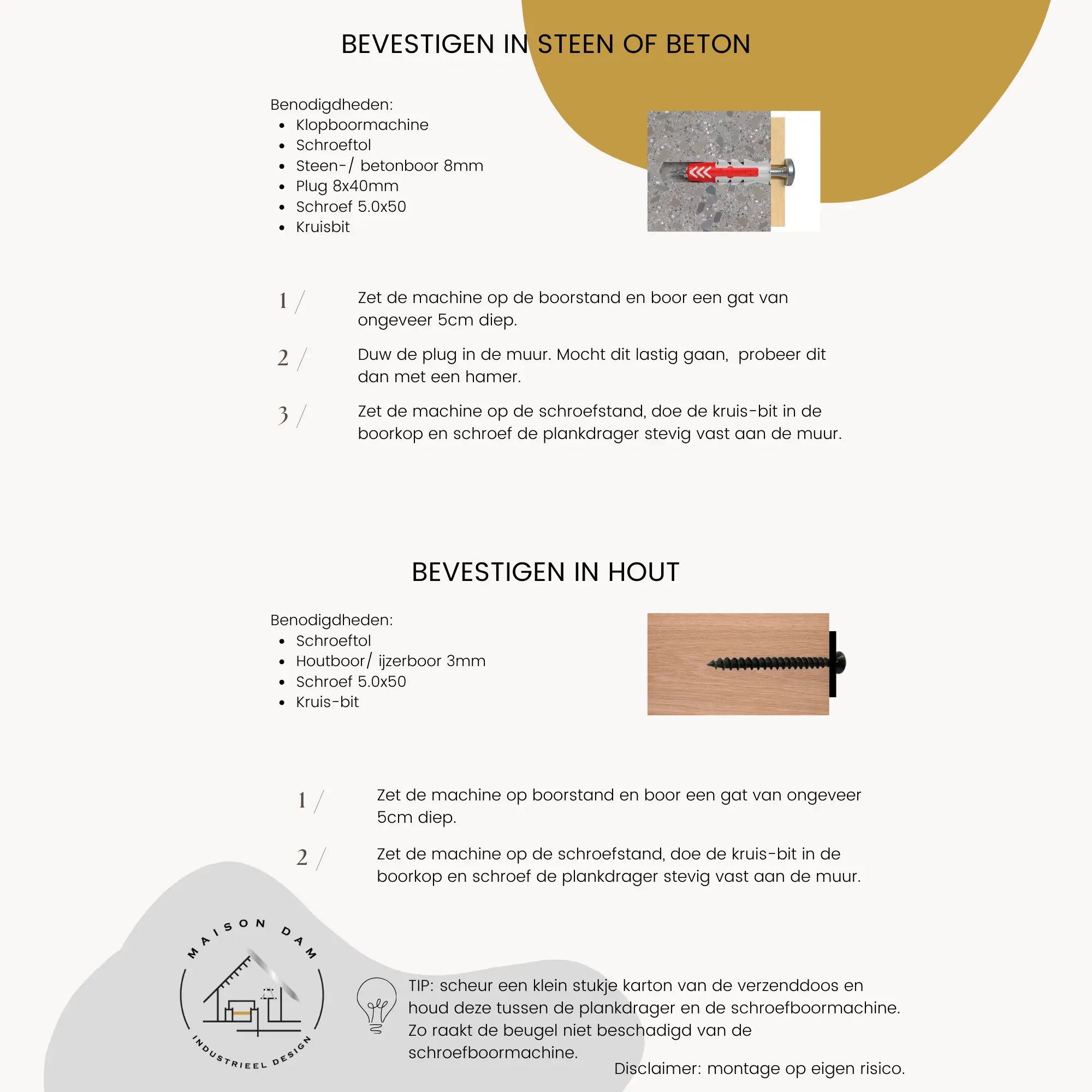 Om de plankdrager te bevestigen gebruik je pluggen en schroeven. Boor gaten van een diameter van 8mm en een diepte van 50mm. De kwaliteit en het materiaal van de muur bepaalt mede de draagkracht van de plankdrager.