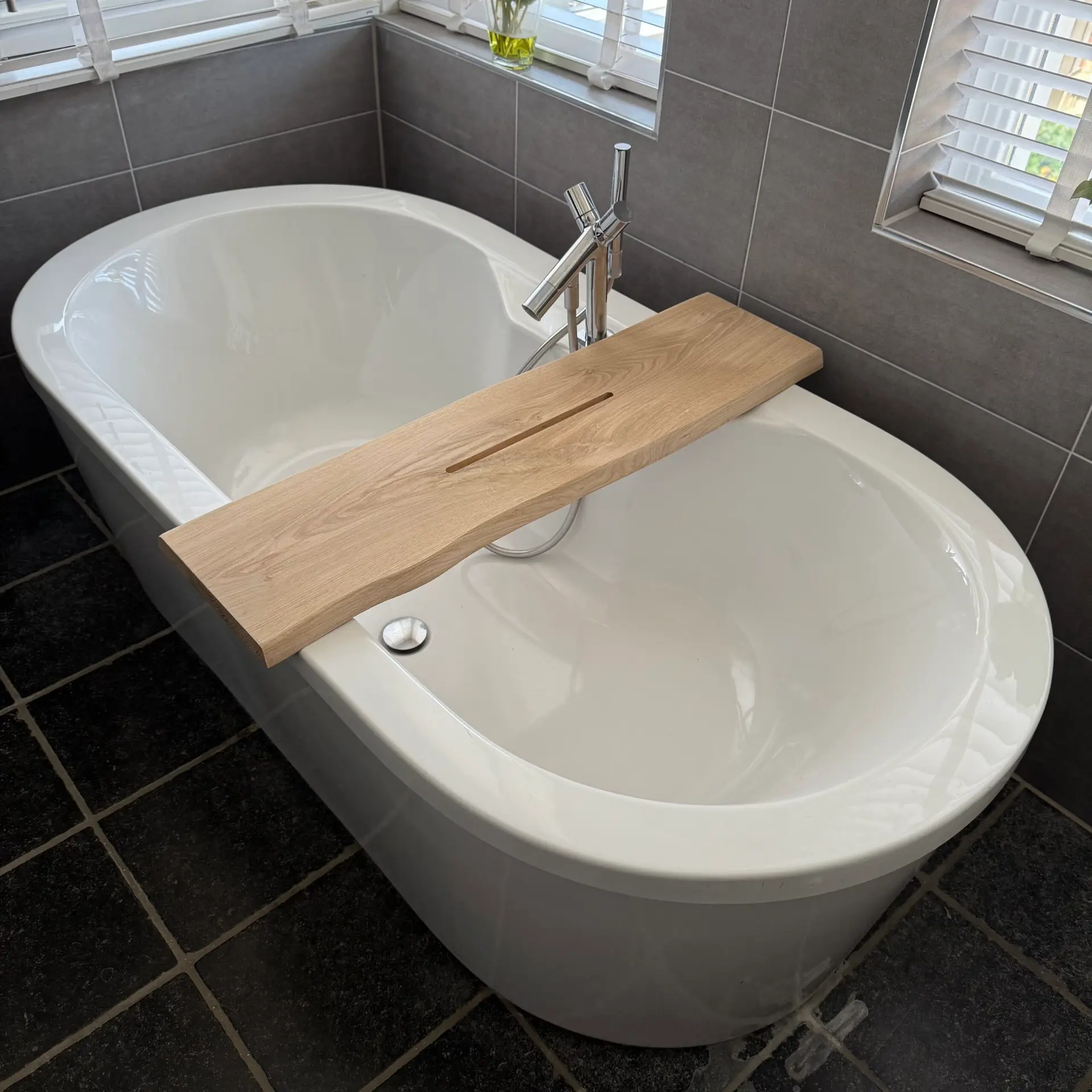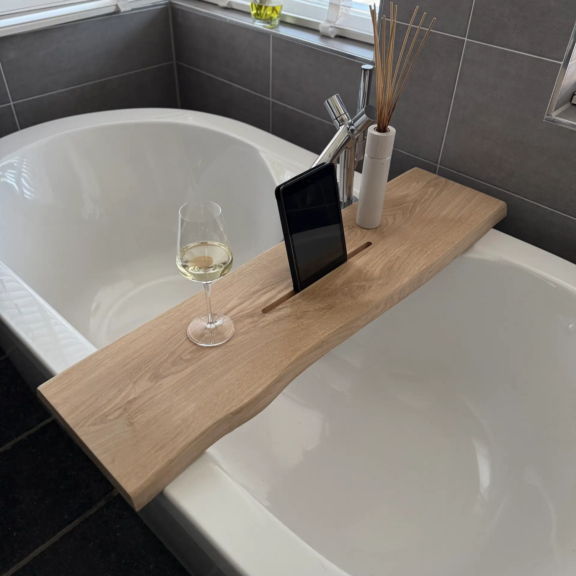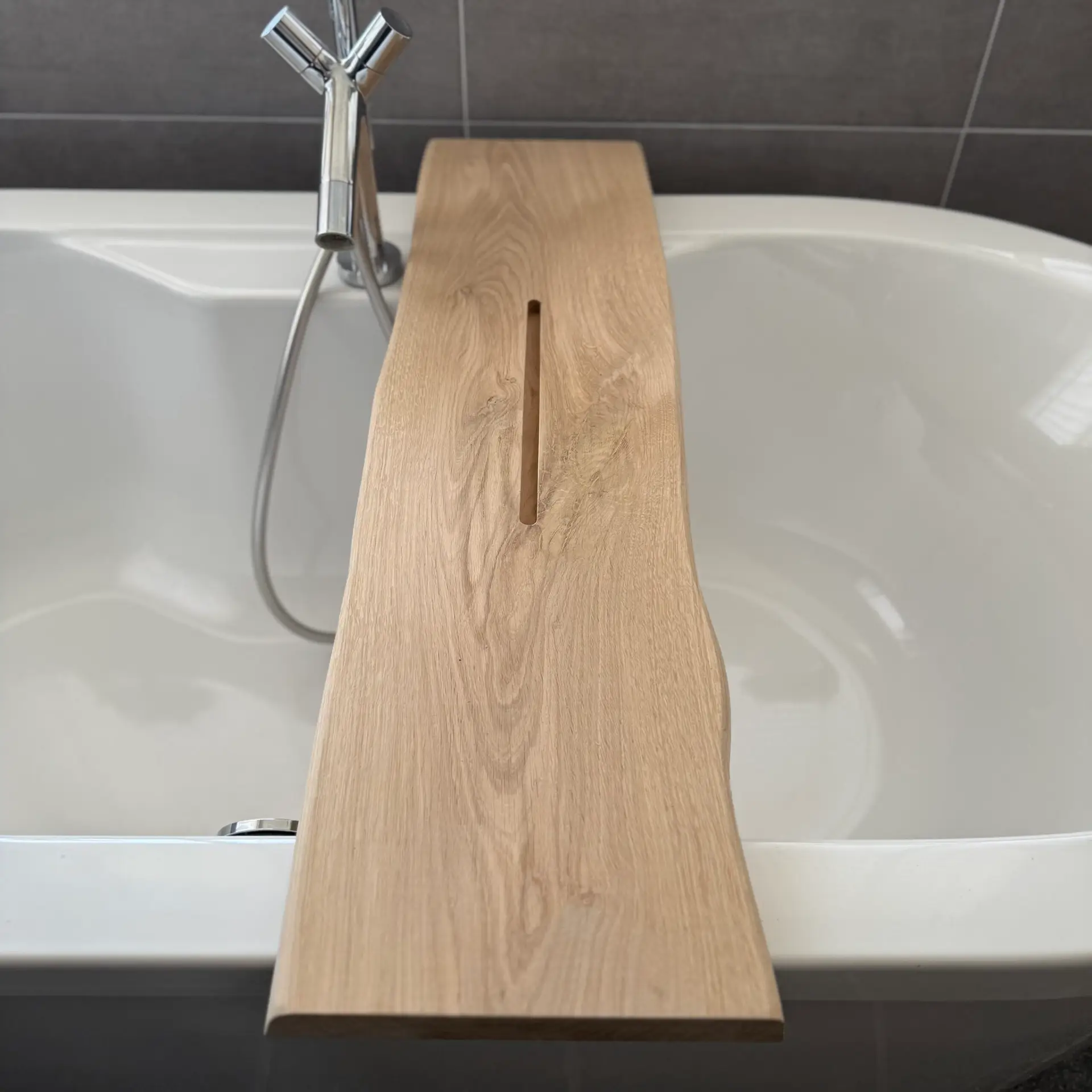 De plank heeft aan één zijde een sleuf van 36 × 1,2 × 1,5 cm om je tablet of telefoon veilig neer te zetten. De andere zijde is glad afgewerkt, zodat je beide kanten naar wens kunt gebruiken. Er blijft genoeg ruimte voor kaarsen, glazen en andere badaccessoires.